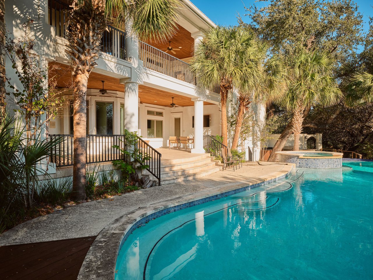 The kitchen is built for entertaining, featuring high-end stainless appliances paired with a dedicated catering kitchen. Outdoor living is equally inviting. Multiple terraces overlook the serene neighborhood, while the infinity pool and spa with waterfall features serve as a peaceful escape. On the main deck, an outdoor kitchen with a built-in grill and sink sits under the shade of a mature tree, ideal for al fresco dining with a view.